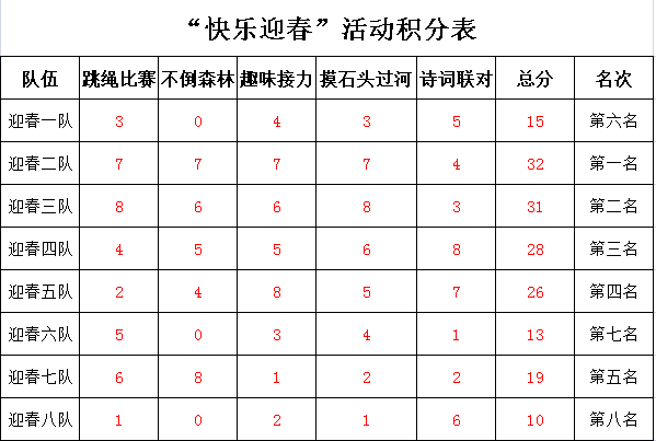 趣味文體活動(dòng)周方案有三分鐘跳長(zhǎng)繩、不倒森林、趣味接力、摸石頭過(guò)河、詩(shī)詞聯(lián)對(duì)五個(gè)團(tuán)隊(duì)項(xiàng)目。在比賽活動(dòng)中,大家本著友誼第一、比賽第二的原則,展現(xiàn)了團(tuán)體協(xié)作、努力拼搏、積極進(jìn)取的精神?,F(xiàn)在讓我們來(lái)回顧一下比賽精彩瞬間吧!